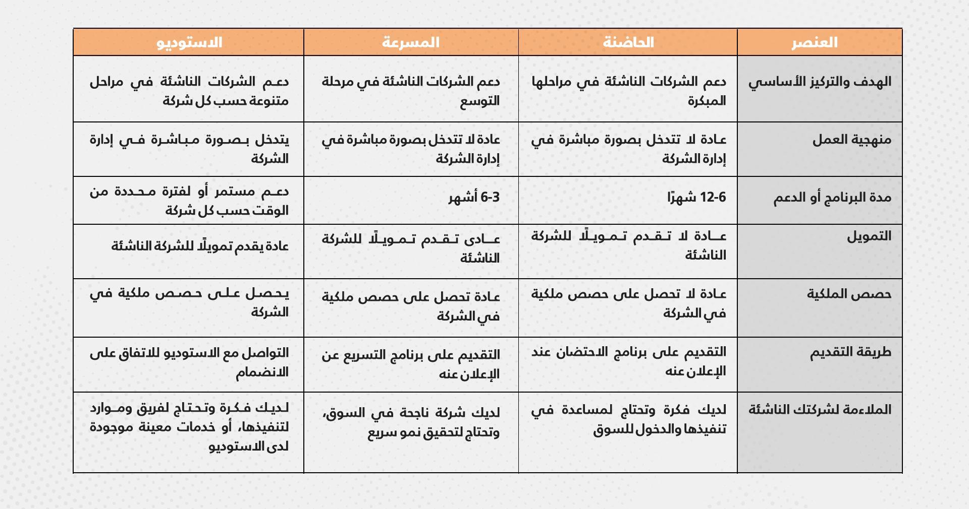 جدول مقارنة بين الحواضن والمسرعات والستوديوهات